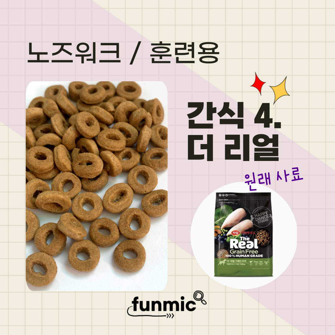 귀여운 도넛 모양의 더 리얼은 사실 사료이다. 하지만 자율배식을 하는 우리집에 더 리얼은 기호성이 너무 좋기 때문에, 훈련용 간식으로 자주 애용한다. (심지어 고양이도 가끔 뺏어먹는다.😅) 간식으로 훈련과 놀이는 해야 하지만 너무 많이 먹을까 봐 걱정이 된다면, 기호성 좋은 사료인 더 리얼을 추천한다.