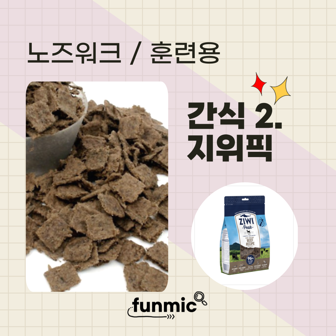 노즈워크 간식의 끝판왕이라고 하는 지위픽은 노르웨이에서 만든 간식이다. 관절 건강에 좋은 녹색 홍합이 함유, 운동성 향상에 도움을 주는 글루코사민과 콘트로이틴도 풍부하고, 비타민과 미네랄도 들어있다. 하지만 기호성에 있어서는 호불호가 갈리는 편이기 때문에 샘플로 먼저 급여해보길 권한다. 우리집 강아지의 경우 처음에는 조금 어색해하다가 지금은 잘 먹는다. (뭐든 잘 먹는 편 😄)