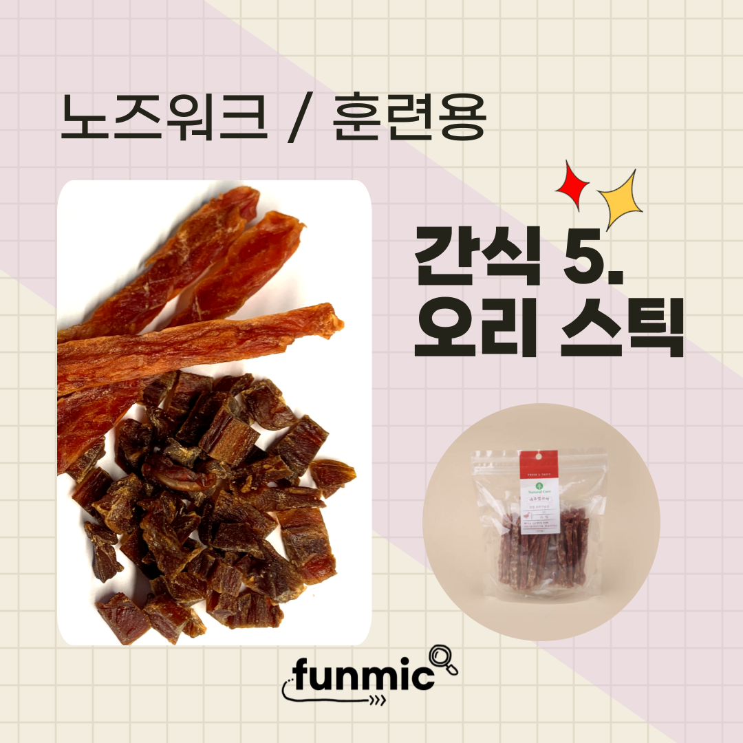 가끔 집에 노즈워크용으로 쓰는 간식이 떨어졌을 때는 길쭉하게 생긴 오리 스틱을 잘라서 준다. 100% 오리 가슴살만 사용한 네츄럴 코어 천연 오리 가슴살은 불포화지방산이 풍부해 모질 건강에 도움을 주고, 단백질과 무기질도 많이 들어있다. 말랑말랑해서 자르기도 쉽고, 기호성도 좋다.